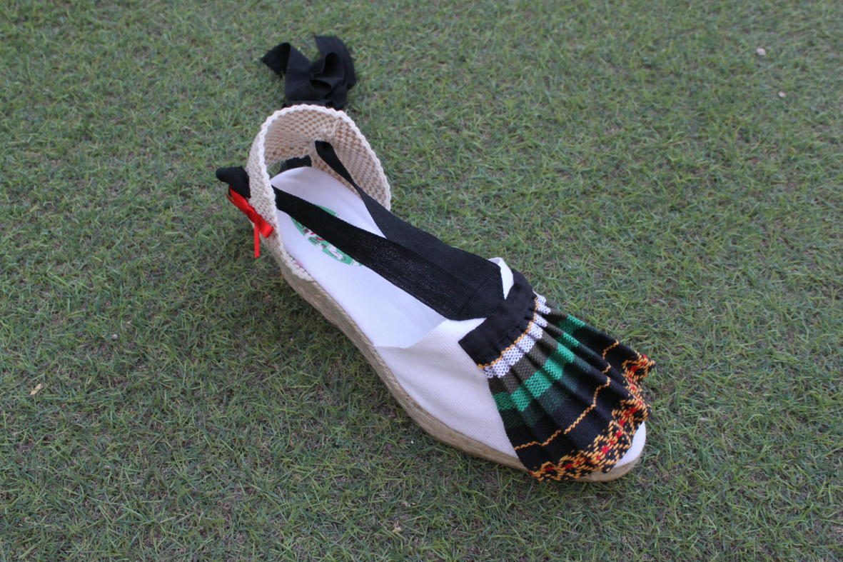 Con puntilla en blanco y verde, y piconella verde de dos tamaños. En el talón lleva también bordeando la misma puntilla. En las cintas de atar lleva cosido también a mano piconella verde.